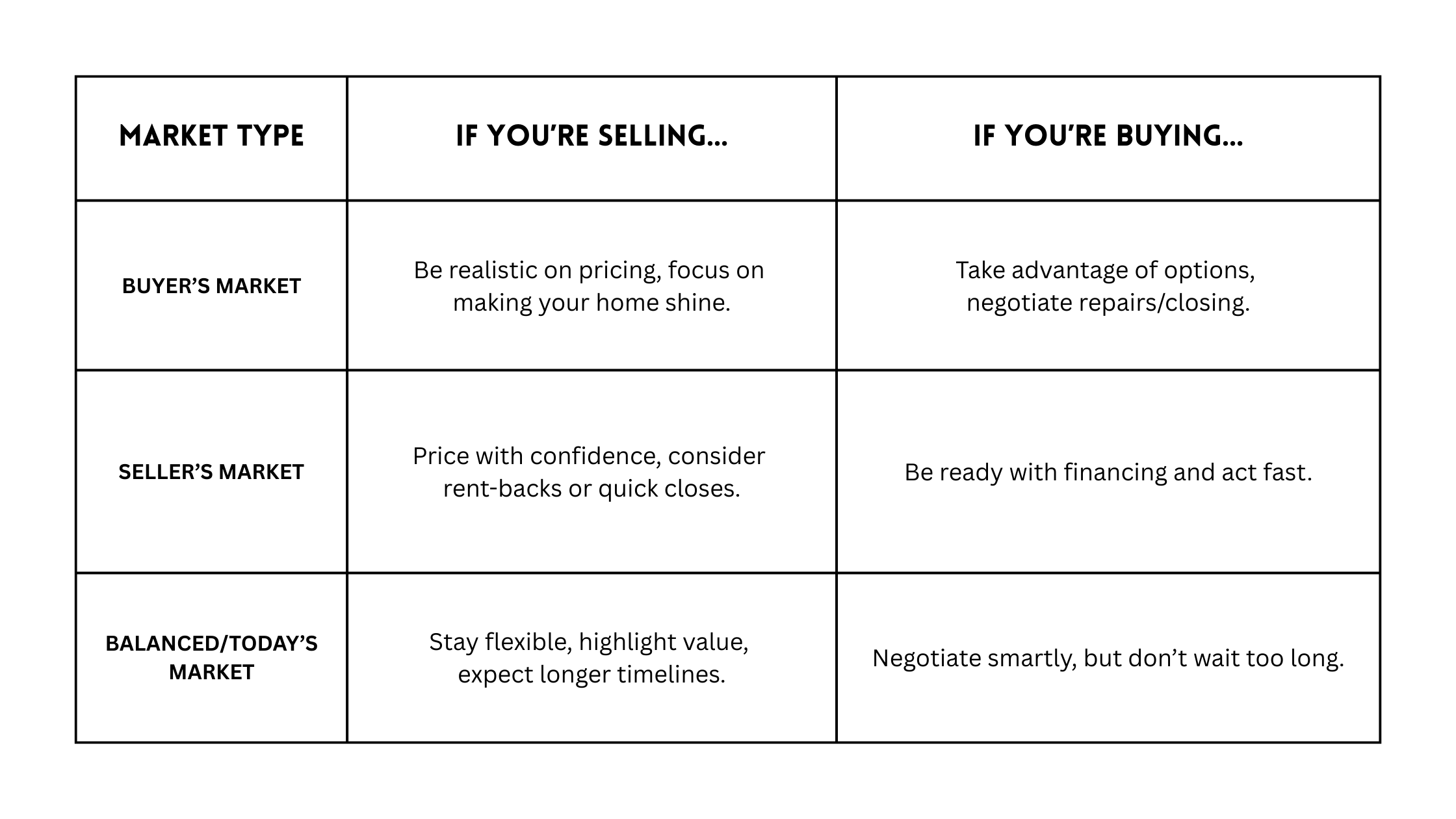 The first step to navigating a buy-sell situation is understanding the market you’re working with. Is it a buyer’s market, a seller’s market, or something in between? Here’s a quick overview of what to expect with each market: